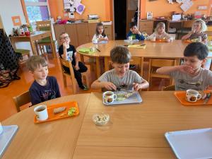 Ve třídě u včeliček si děti samy mažou svačinky.
